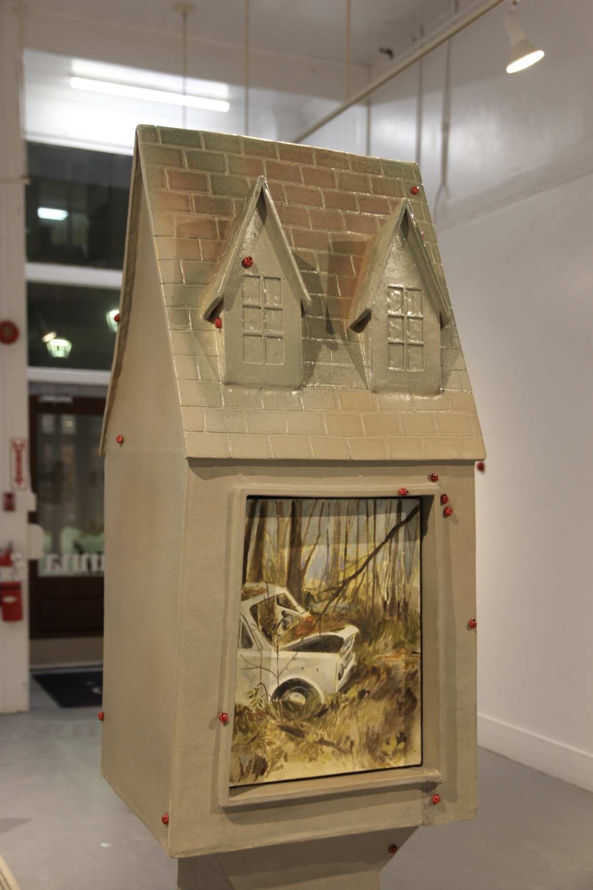 Free Real Estate is a large-scale ceramic sculpture that transforms an everyday object into an instrument for reflection, movement, and the passage of time. Drawing from her upbringing, moving between homes, and experience of loss at a young age, Miron reimagines the house-box—a familiar real estate newspaper dispenser—as a symbol of displacement and nostalgia. Standing five feet tall, the piece frames an oil painting of a weathered truck slowly being reclaimed by nature. Ladybugs crawl across the sun-faded surface, introducing a sense of whimsy and childhood familiarity, while reinforcing themes of decay and transformation. For Miron, these elements reflect an ongoing dialogue between human-made environments and nature’s inevitability, and how ownership, permanence, and “home” are ultimately transient concepts.