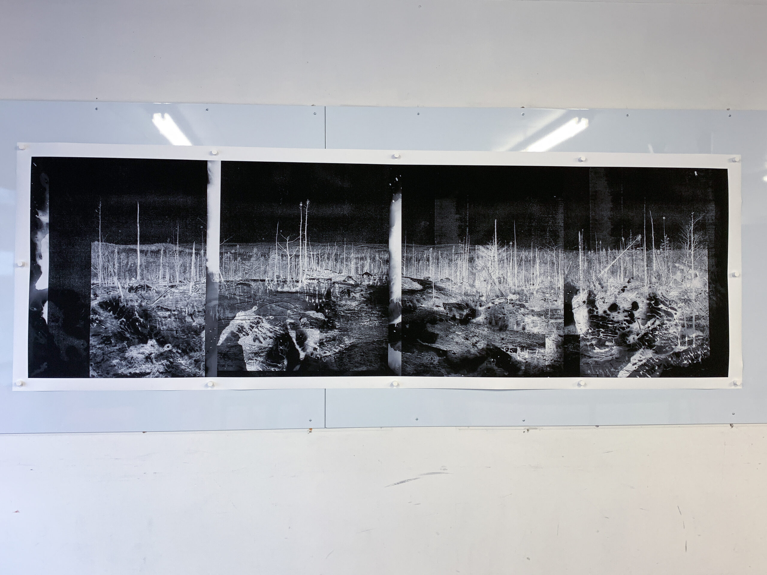 Mnikwaqnik is a striking black-and-white giclée landscape print that documents the aftermath of the 2025 wildfire in the Birch Cove Lakes Wilderness Area. Using a combination of digital and large-format photography, Williams travelled on-site to capture the decimated tree line. The result is four gelatin silver contact prints—which were then inverted, printed, and reassembled to form a seamless, haunting panorama. The piece transforms a once lively vista into a dystopian landscape, drawing awareness to the increasing frequency of wildfires, and human impact on the natural world. By layering and stitching the images, Williams emphasizes the textures, contrasts, and lingering presence of the affected wilderness, inviting viewers to witness a space caught between devastation and regeneration.