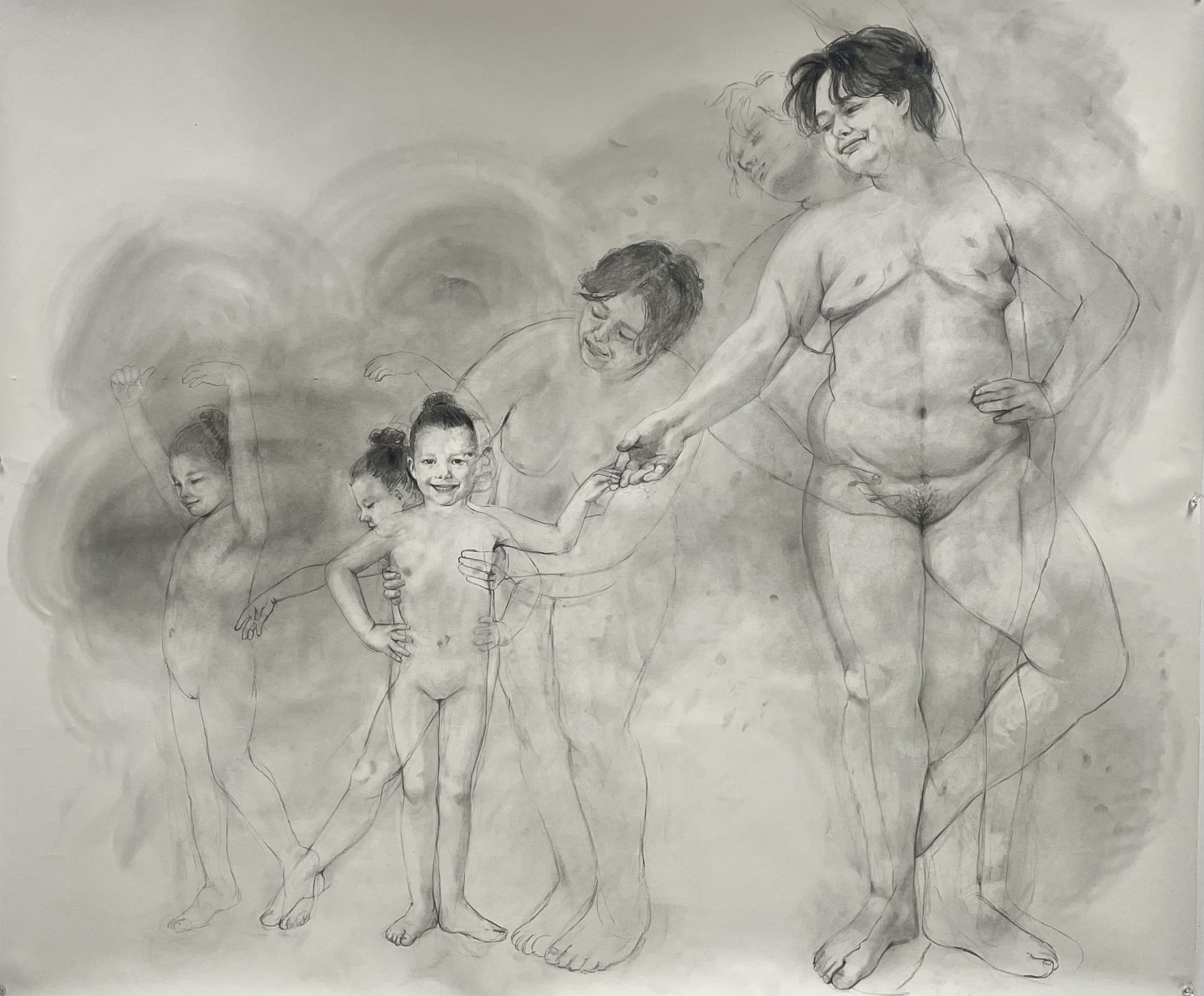 Was & Am, Am & Was is a charcoal self-portrait that explores the fluid relationship between identity, childhood, and the body. Through the juxtaposition of two figures, himself as a young child and as he is now, West reflects on the intersections of gender, personal history, and self-perception—presenting identity as something continuously unfolding. Developed through a process of layering and reductive drawing, the work builds from a soft charcoal ground, with forms emerging through addition and erasure. Rather than separating past and present, West allows them to exist simultaneously, each version of the self informing and reshaping the other. The result is an image that feels both intimate and in flux, capturing the emotional complexity of growth and self-recognition. West invites viewers to consider their own relationship to their bodies and identities, emphasizing that who we are is not a replacement of what came before, but an accumulation of lived experience.