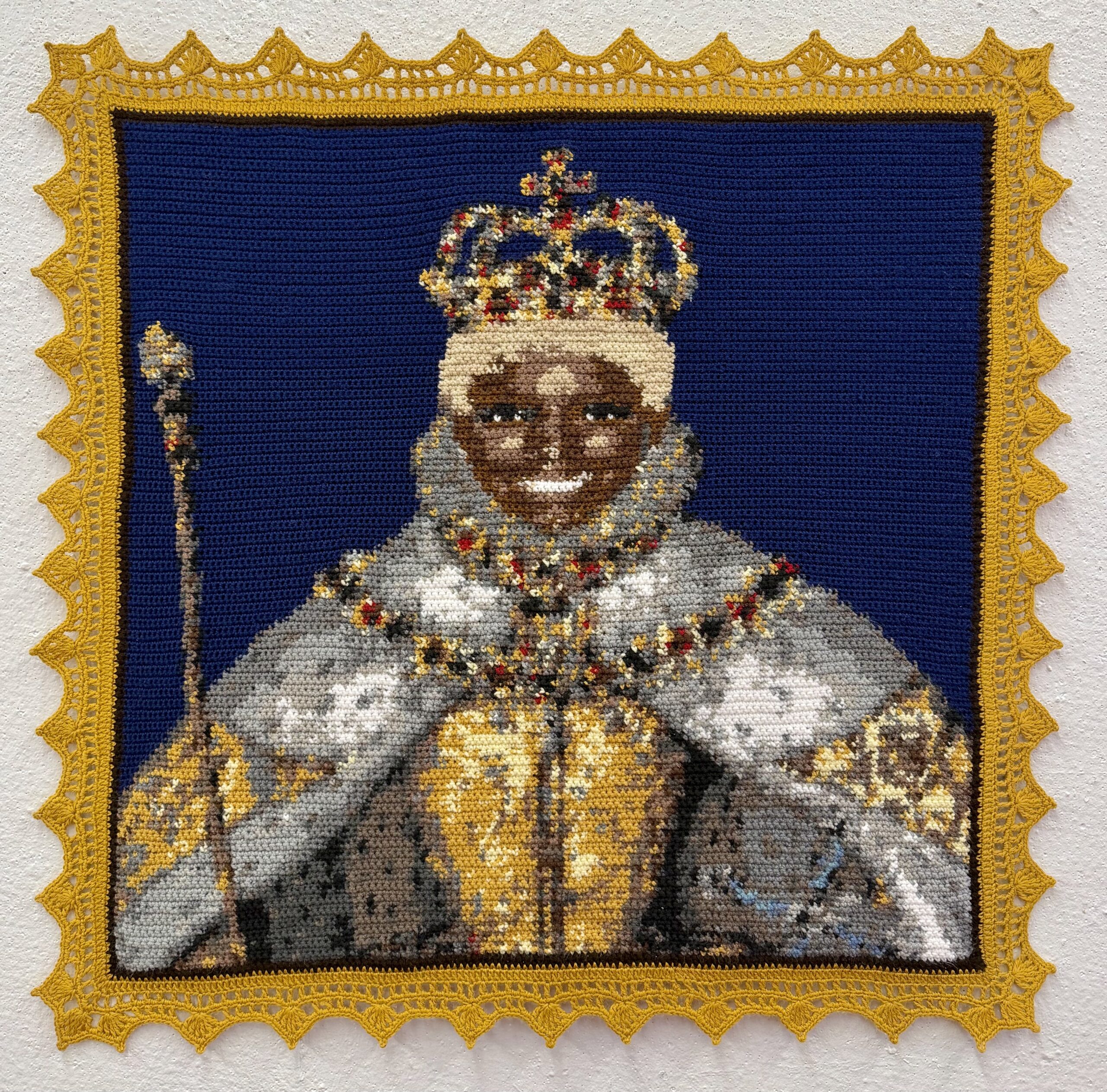 Queen NeNe I is part of a larger body of work—titled, Cohen’s Crown Jewels—a series of crocheted tapestries depicting historical monarchs, with the faces of the women of The Real Housewives franchise superimposed over their body. In this work, NeNe Leakes, of The Real Housewives of Atlanta, is rendered in the likeness of Queen Elizabeth I, from her 17th-century coronation portrait. Blending satire with art history, Spooner examines identity, celebrity culture, and parasocial relationships through the centuries. By framing historical rulers as early celebrities and the Housewives as modern monarchs, Spooner highlights the performative nature of these highly visible roles, and the double-edged sword of power and influence within their respective eras. Through tapestry, Spooner mirrors the pixelated world of television, underscoring how images, authority, and cultural influence are constructed and consumed across time.