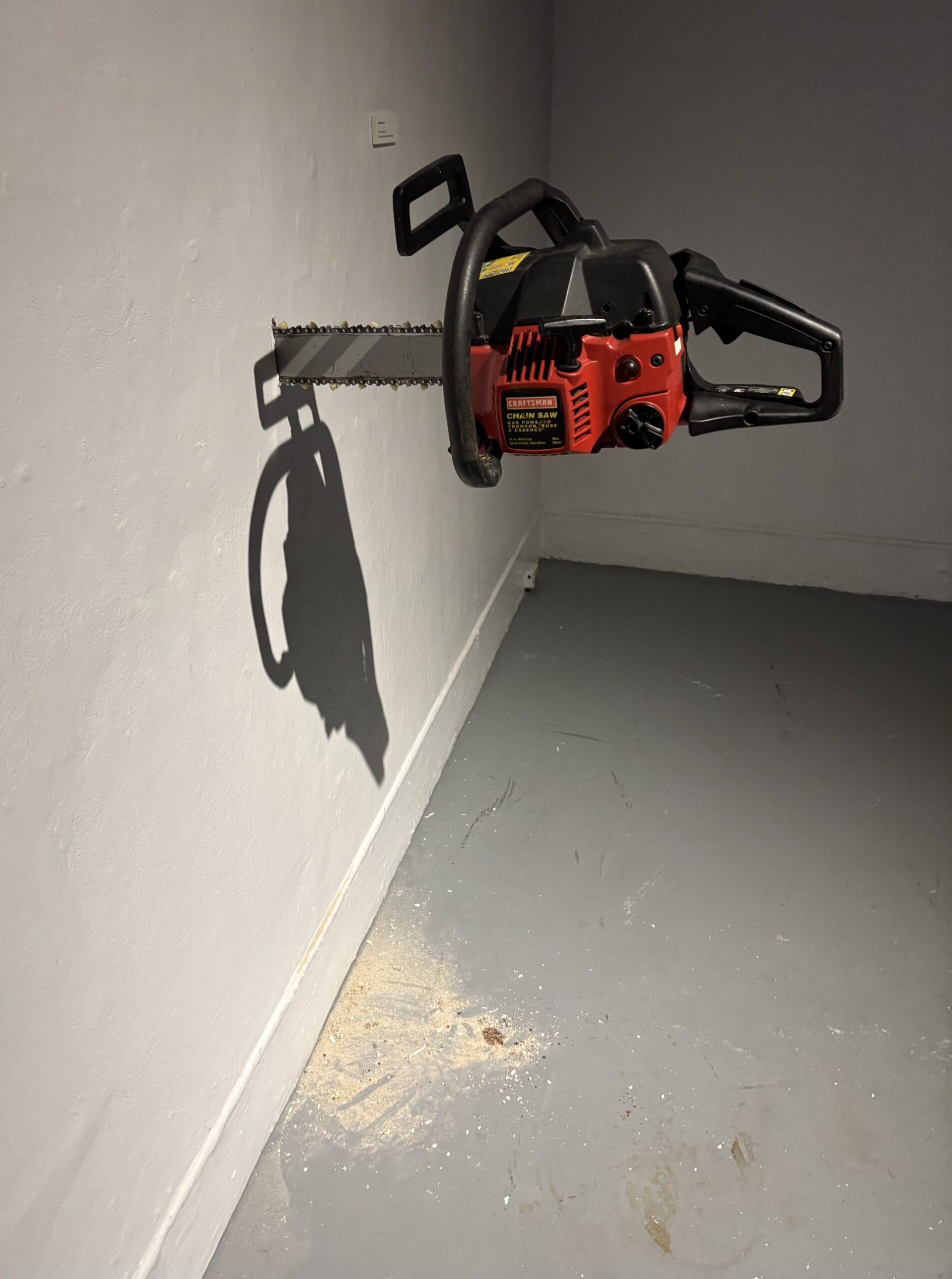 give’r the teeth is a decommissioned gas-powered chainsaw, with composite resin replicas of human teeth in place of each of the saw’s cutting teeth. Embedded into the gallery wall, the saw juts outward mid-motion, surrounded by scattered drywall debris—an image that is simultaneously violent, and strangely intimate. By replacing the teeth, McDonald transforms the saw from a tool of destruction, into a conduit for self-reflection. Rooted in her experience growing up in a rural space, McDonald interrogates how labour, gender, and place shape the self. As a site-specific installation, give’r the teeth blur the lines between art and labour, rural and urban, tool and body—sparking discussion about the importance of rural experiences within contemporary art spaces.
