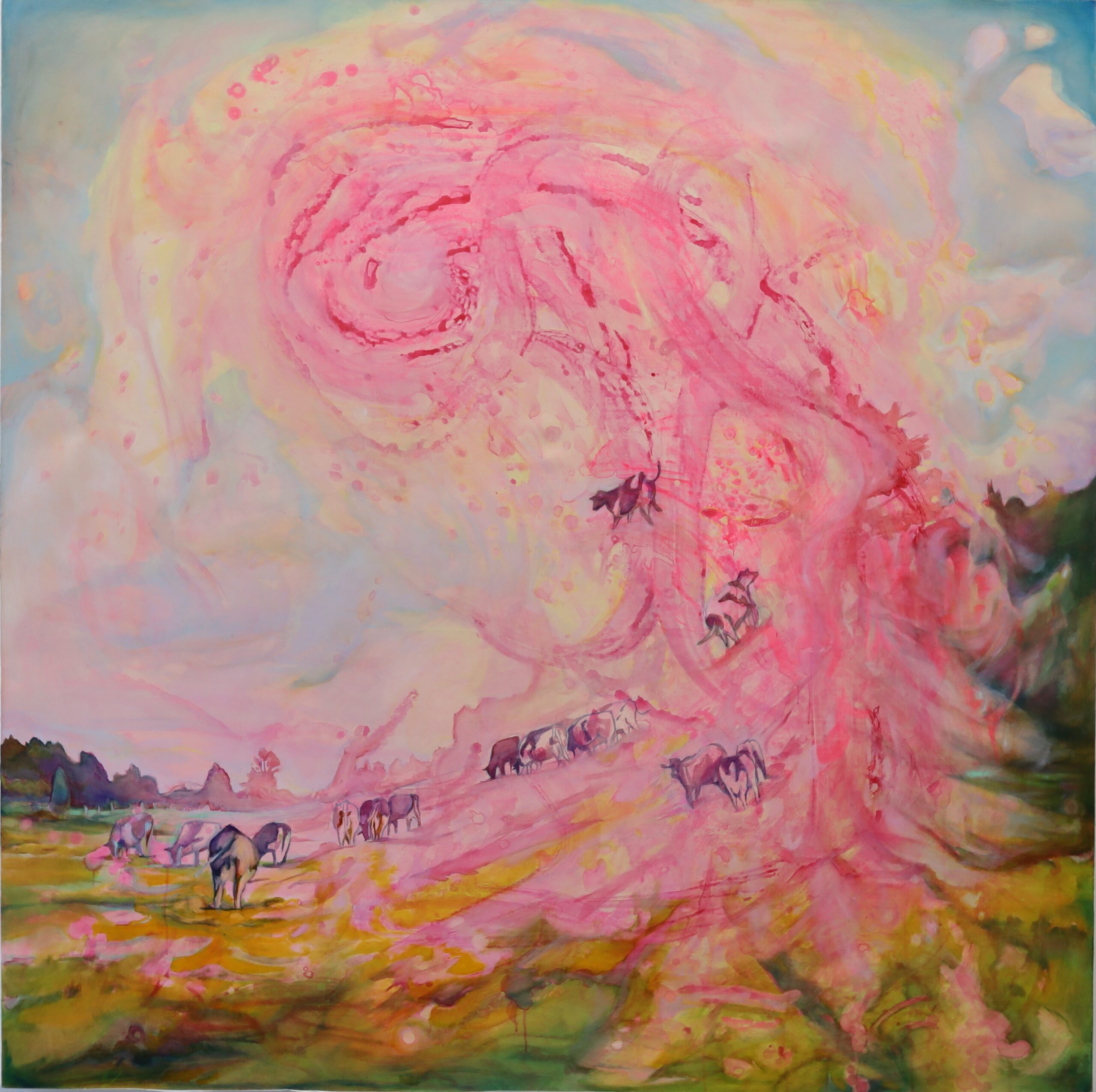 Out to Pasture is a large-scale painting that reflects home, displacement, and the shifting relationship between land and identity. Combining oil glazing techniques and acrylic washes, Bouwers layers a vivid pink abstraction over a carefully rendered image of her childhood dairy farm, gradually dissolving the landscape into an uncertain, fluid space. Rooted in Bouwers’ experience of losing her family farm due to urban development, the painting navigates complex emotions of nostalgia, loss, and acceptance. Cows drift through the composition, becoming unmoored as they move toward abstraction, mirroring the artist’s own sense of dislocation. By contrasting synthetic acrylic with traditional oil painting, Out to Pasture captures the feeling of watching something familiar slip away, while questioning what it means to belong.